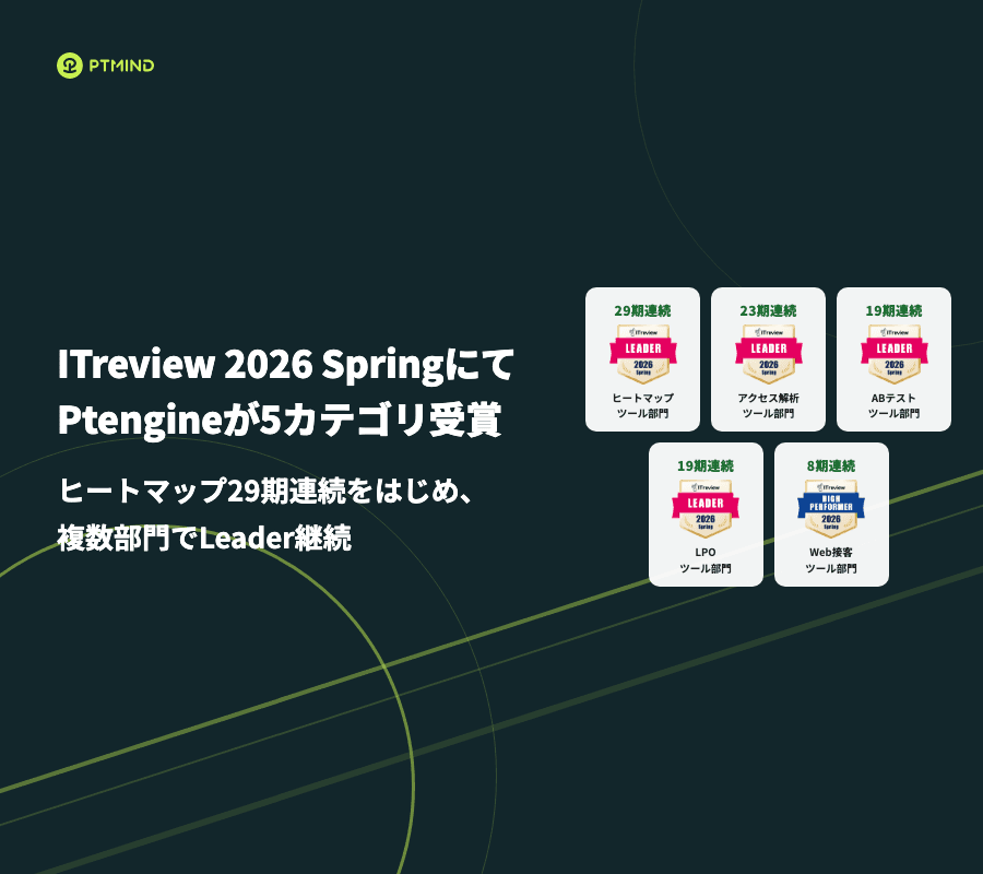 Ptmindが提供するWebマーケティングツール「Ptengine」は、ソフトウェアレビュープラットフォーム「ITreview」が選出する「ITreview 2026 Spring Award」において、5つのカテゴリで受賞しました。